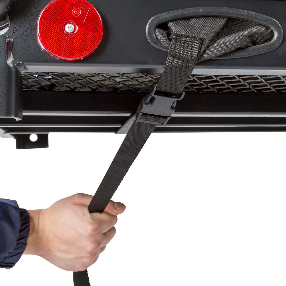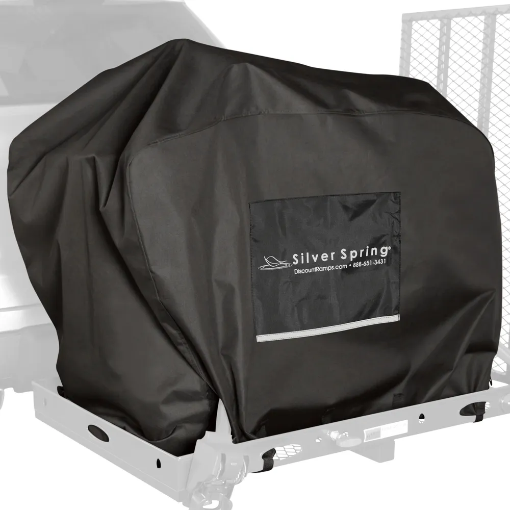Designed for use with scooters, this durable mobility scooter transport cover from Silver Spring has corner hook and loop slits to secure over the tie-down straps, while two integrated webbing belts fasten underneath to hold the entire mobility cover in place for a tight fit.