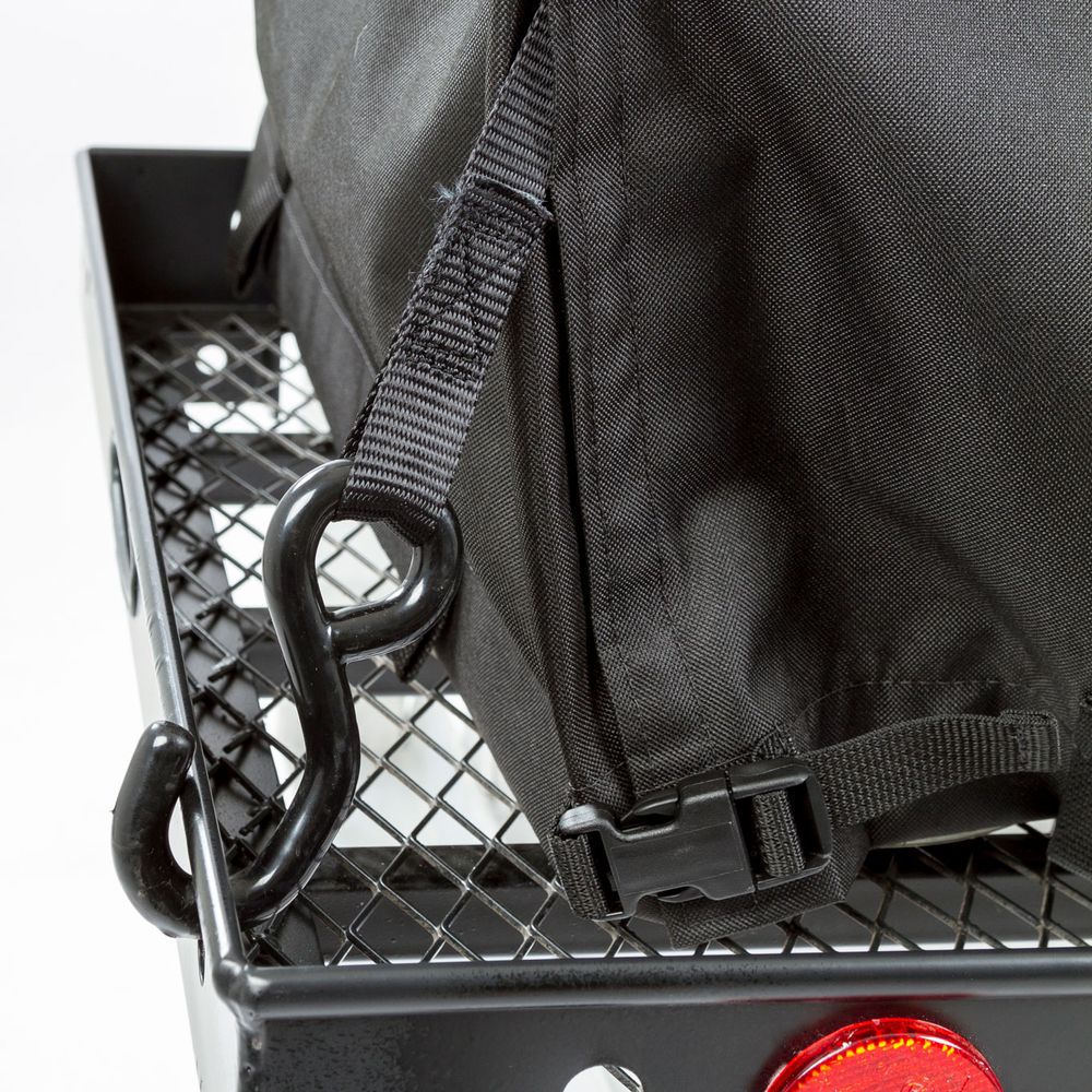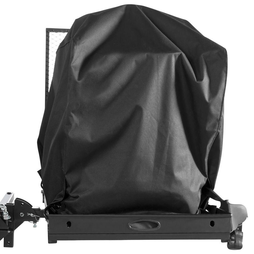 Made from lightweight, durable, nylon this cover features four slit openings for tie downs to keep the cover in place, even at highway speeds. This cover measures 55" L x 28" W x 33" H, and features a rubberized interior membrane coating to keep your chair dry in all wet or snowy weather. The cover has two 1" wide, built-in tie down straps with plastic buckles to secure across the bottom of the carrier, holding the cover in place. Four additional nylon loops on each side give you the option to strap the cover down at additional points.