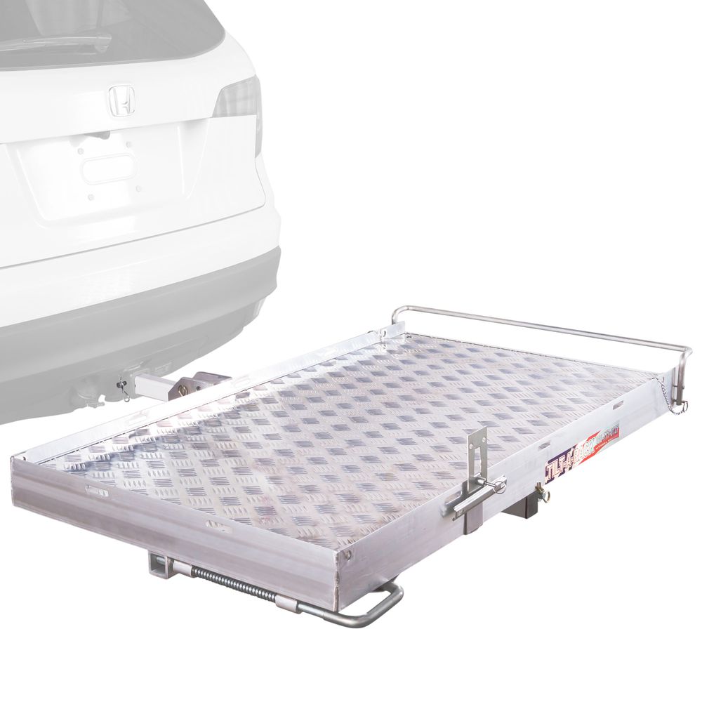 To use the carrier simply pull the tilt handle, slide out the ramp from under the platform, tilt towards the ground and you are ready for loading. The entire carrier shifts back to its original upright position using the weight of the scooter while it is being loaded. This is by far the easiest and safest loading system available on the market with no ramps to fold, unfold or stow away separately. This full size carrier is specifically designed to carry most full size scooter and chairs that weigh up to 500 lbs.
