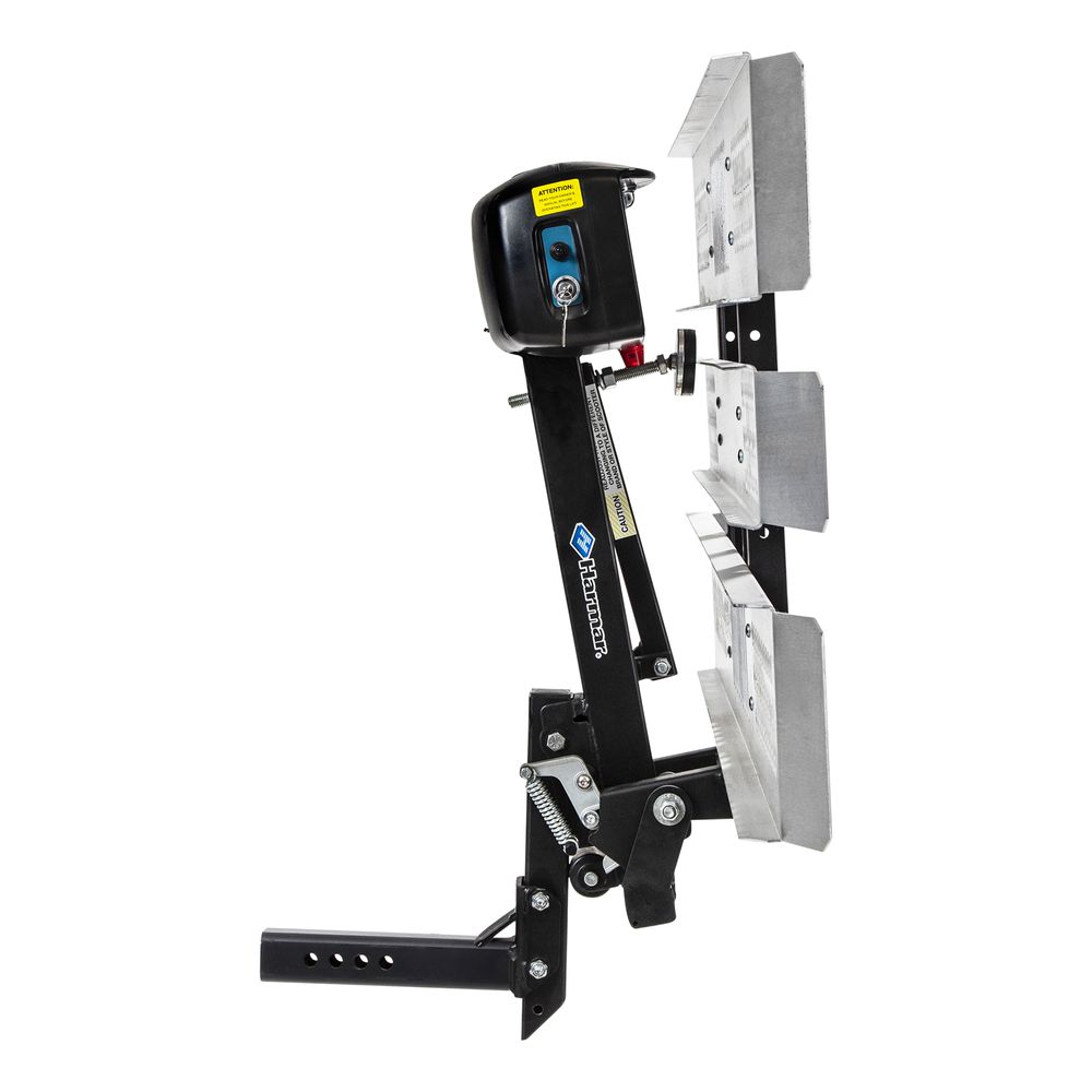 - Includes automatic hold-down foot and wheel chocks, manual crank backup, and illuminated license plate holder
