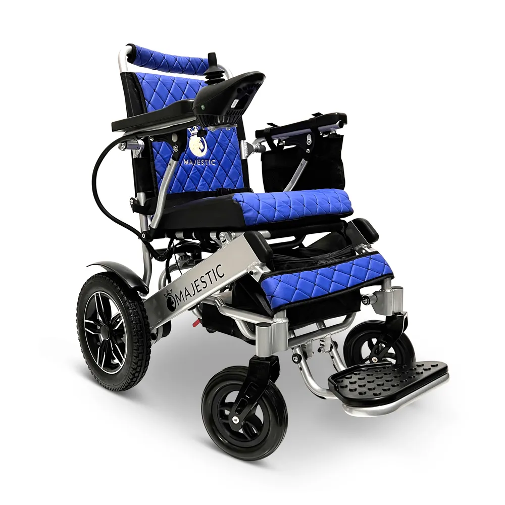 ComfyGo Majestic 12AH Remote-Controlled Electric Wheelchair with 17.5" Seat - Silver Frame/Blue Faux Leather
