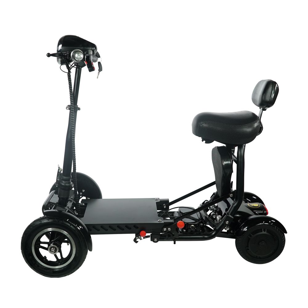 - Folding mobility scooter with a standard seat; up to 12MPH