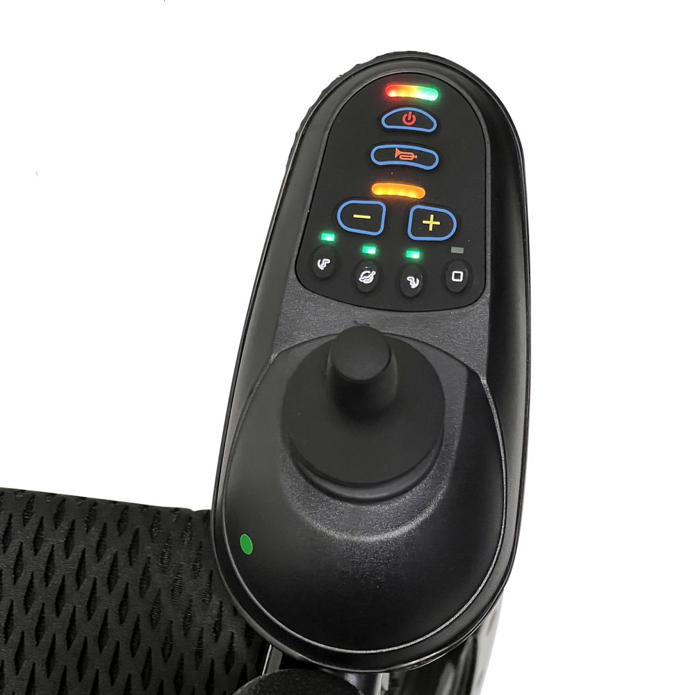 A lightweight champion in its class, this electric wheelchair weighs 86 lbs. without the battery. The 360-degree universal intelligent joystick allows users to navigate effortlessly and enjoy the added convenience of controlling the backrest and leg rests either via joystick or the included remote controller.