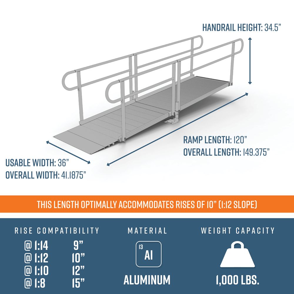 This 10' L Straight Modular Ramp Kit Includes one 6' ramp, one 4’ ramp, handrails, and all other necessary components. Depending on your rise and location, this ramp can be installed to accommodate slopes ranging from 1:8 to 1:14.