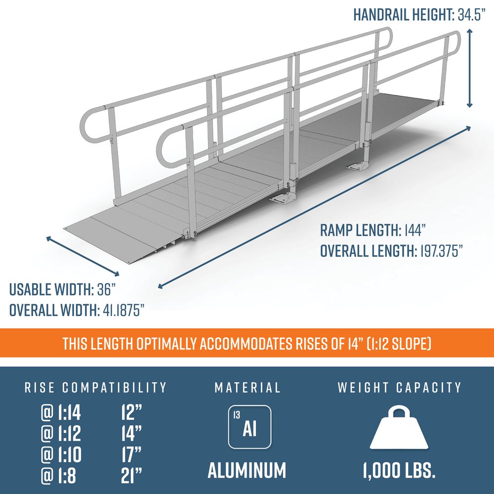 This 14' L Straight Modular Ramp Kit Includes one 6' ramp, two 4’ ramps, handrails, and all other necessary components. Depending on your rise and location, this ramp can be installed to accommodate slopes ranging from 1:8 to 1:14.