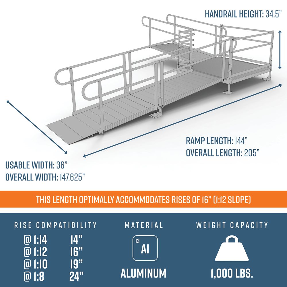 This 16' L L-Shaped Modular Ramp Kit w/5' Turn Platform Includes two 6' ramps, one 4’ ramp, one 5' x 5' turn platform, handrails, and all other necessary components. Depending on your rise and location, this ramp can be installed to accommodate slopes ranging from 1:8 to 1:14.