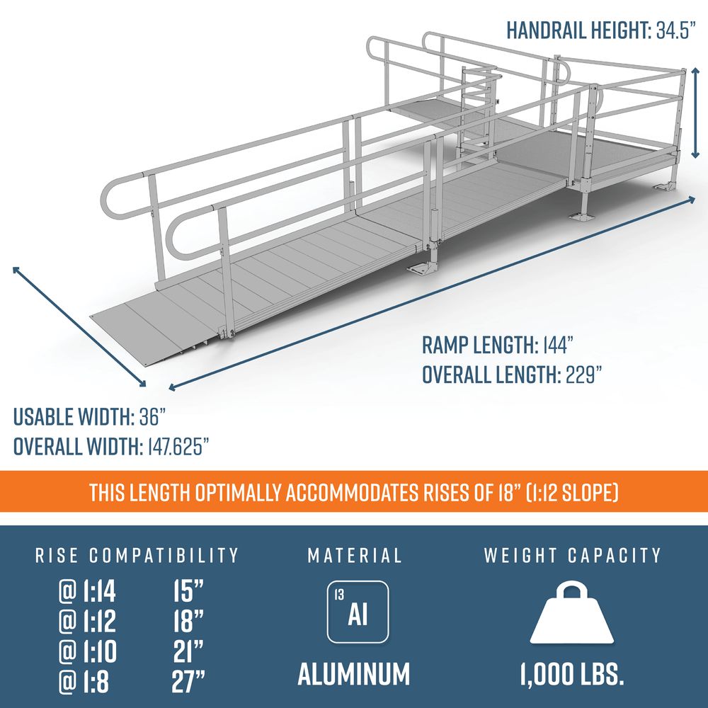 This 18' L L-Shaped Modular Ramp Kit w/5' Turn Platform Includes three 6' ramps, one 5' x 5' turn platform, handrails, and all other necessary components. Depending on your rise and location, this ramp can be installed to accommodate slopes ranging from 1:8 to 1:14.