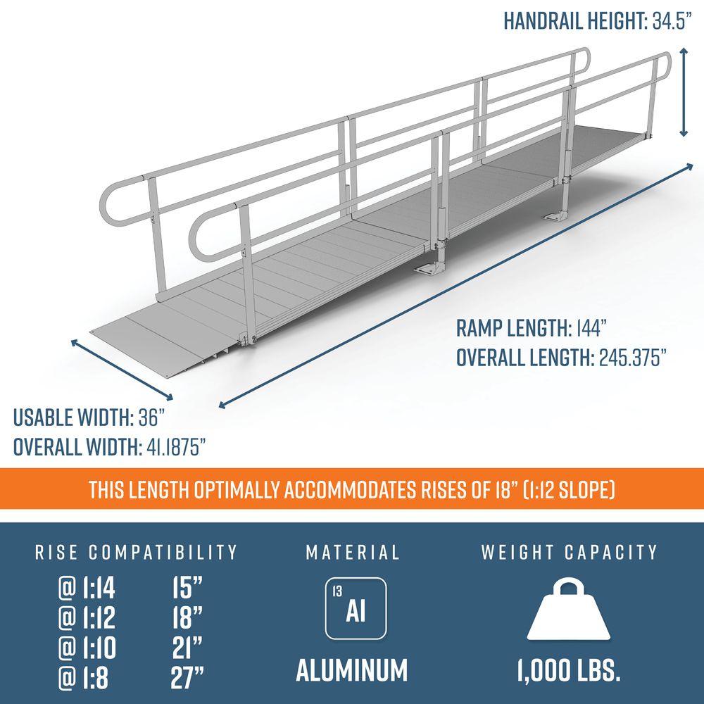 This 18' L Straight Modular Ramp Kit Includes three 6' ramps, handrails, and all other necessary components. Depending on your rise and location, this ramp can be installed to accommodate slopes ranging from 1:8 to 1:14.