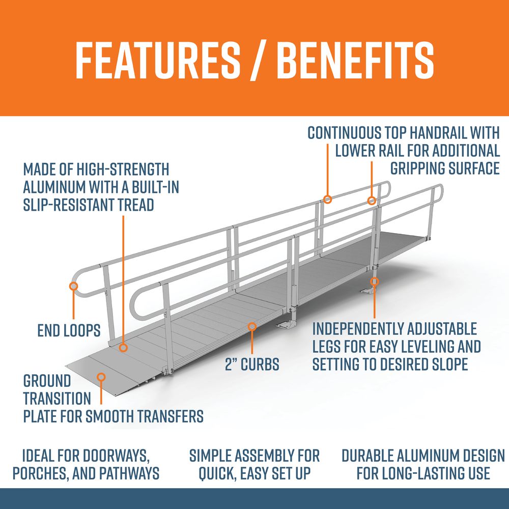 Constructed from high-strength aluminum with an extruded tread for all-weather traction, the ramp kit features multi-positional base feet with independently-adjustable legs so that setting the slope and leveling the ramp is as easy as possible. The lower plate ensure smooth ramp-to-ground transitions for mobility devices, and both the 2” curbs and two-tier handrails provide additional safety and security whether wheeling or walking. The flush finished sides have no protruding pieces in the ramp area to prevent catching.