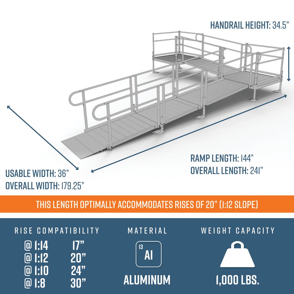 This 20' L L-Shaped Modular Ramp Kit w/4' Platforms Includes two 6' ramps, two 4’ ramps, one 4' x 4' top platform, one 4' x 4' turn platform, handrails, and all other necessary components. Depending on your rise and location, this ramp can be installed to accommodate slopes ranging from 1:8 to 1:14.