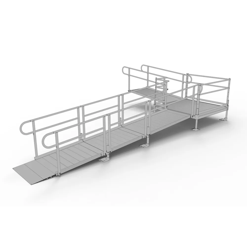 This 20' L L-Shaped Modular Ramp Kit w/5' Turn Platform Includes two 6' ramps, two 4’ ramps, one 5' x 5' turn platform, handrails, and all other necessary components. Depending on your rise and location, this ramp can be installed to accommodate slopes ranging from 1:8 to 1:14.