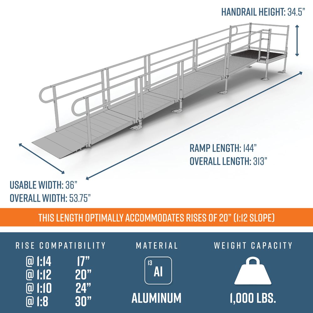 This 20' L Straight Modular Ramp Kit w/4' Top Platform Includes two 6' ramps, two 4’ ramps, one 4' x 4' top platform, handrails, and all other necessary components. Depending on your rise and location, this ramp can be installed to accommodate slopes ranging from 1:8 to 1:14.