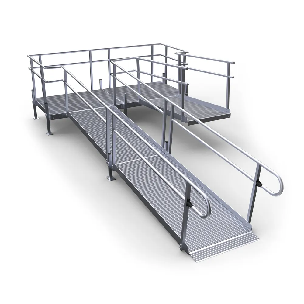 Features a 7' upper ramp, two 4' x 5' turning platforms, and two 7' lower ramp sections with support stands. The handrails on both sides of the full length of the ramp, as well as on the platforms, allow pedestrians to support and aid themselves as they walk up or down the ramp. A low gradient, non-slip surface enhances accessibility at your home for both pedestrians and those who use mobility aids.
