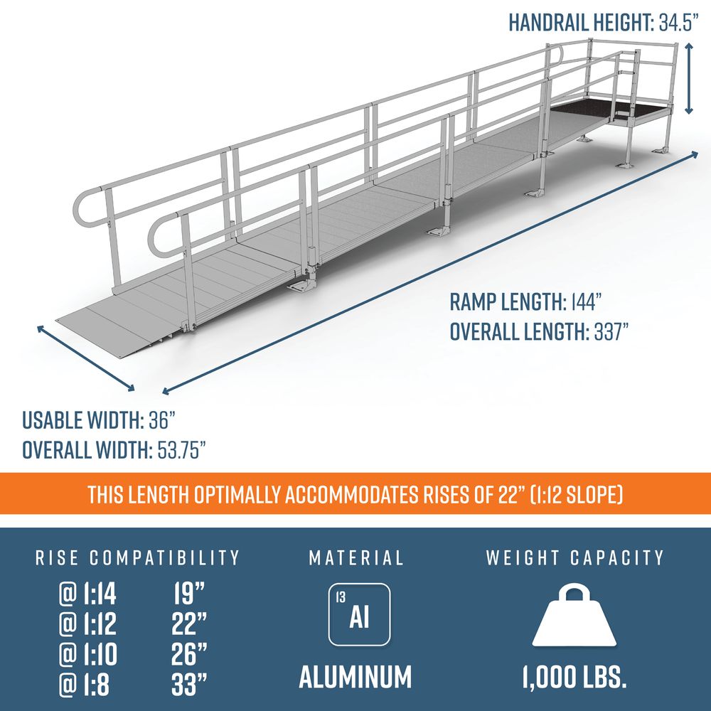 This 22' L Straight Modular Ramp Kit w/4' Top Platform Includes three 6' ramps, one 4’ ramp, one 4' x 4' top platform, handrails, and all other necessary components. Depending on your rise and location, this ramp can be installed to accommodate slopes ranging from 1:8 to 1:14.