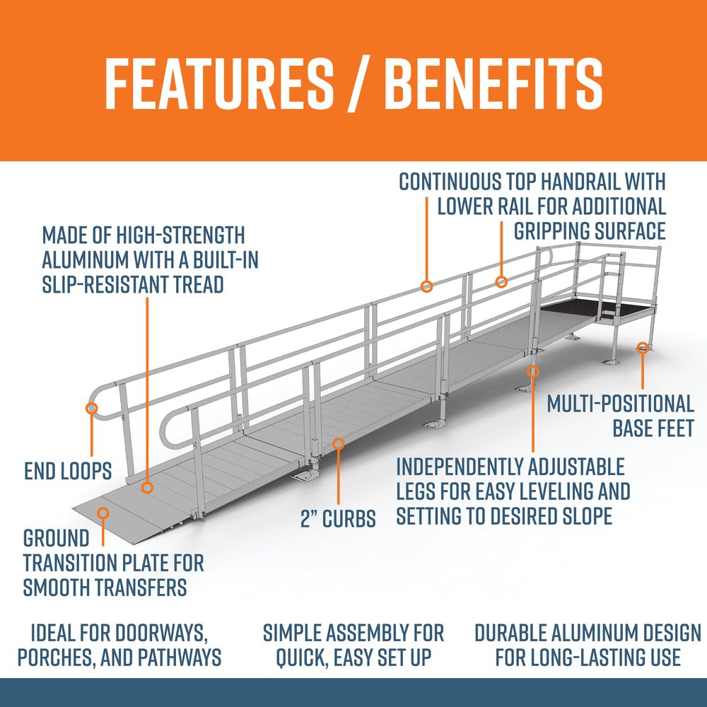 Constructed from high-strength aluminum with an extruded tread for all-weather traction, the ramp kit features multi-positional base feet with independently-adjustable legs so that setting the slope and leveling the ramp is as easy as possible. The lower plate ensure smooth ramp-to-ground transitions for mobility devices, and both the 2” curbs and two-tier handrails provide additional safety and security whether wheeling or walking. The flush finished sides have no protruding pieces in the ramp area to prevent catching.