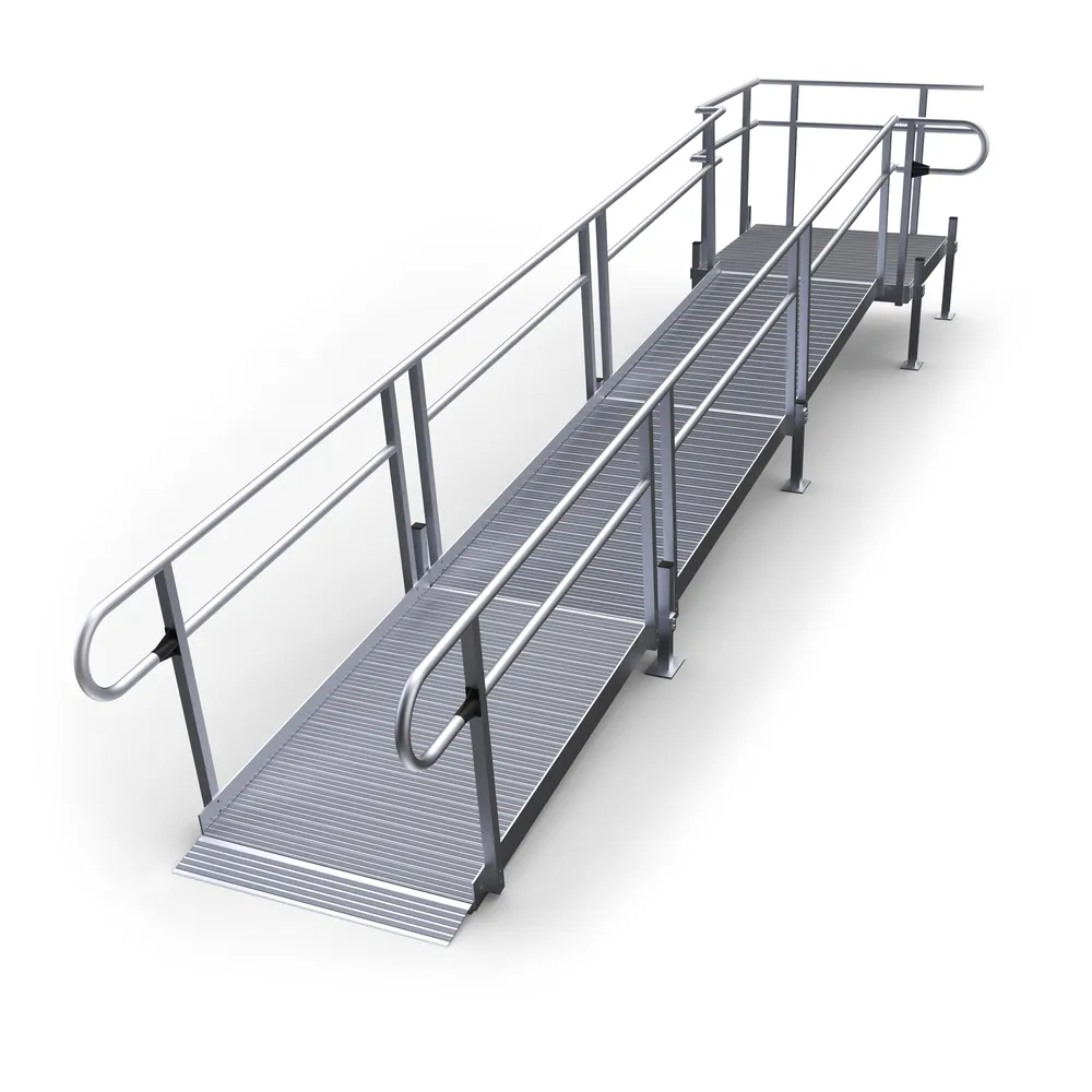 Featuring three 8' ramp sections and a 5' x 5' top platform designed for left- or right-side entry onto the ramp. Makes your home accessible for anyone, regardless of ability. The tapered, lower ramp plate creates a smooth ground-to-ramp transition. Smooth, looped double handrails provide stability for individuals walking or using a mobility device.