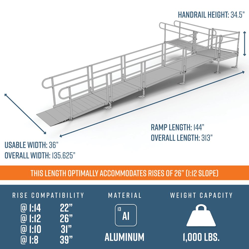 This 26' L L-Shaped Modular Ramp Kit w/4' Turn Platform Includes three 6' ramps, two 4’ ramps, one 4' x 4' turn platform, handrails, and all other necessary components. Depending on your rise and location, this ramp can be installed to accommodate slopes ranging from 1:8 to 1:14.