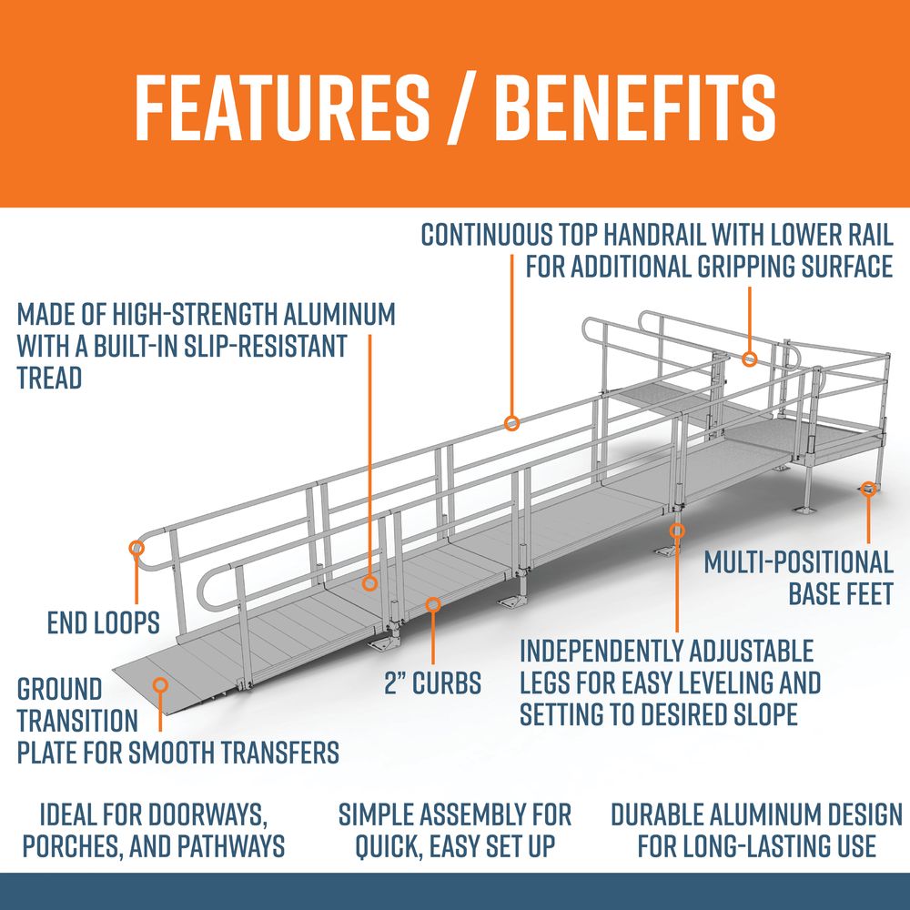 Constructed from high-strength aluminum with an extruded tread for all-weather traction, the ramp kit features multi-positional base feet with independently-adjustable legs so that setting the slope and leveling the ramp is as easy as possible. The lower plate ensure smooth ramp-to-ground transitions for mobility devices, and both the 2” curbs and two-tier handrails provide additional safety and security whether wheeling or walking. The flush finished sides have no protruding pieces in the ramp area to prevent catching.