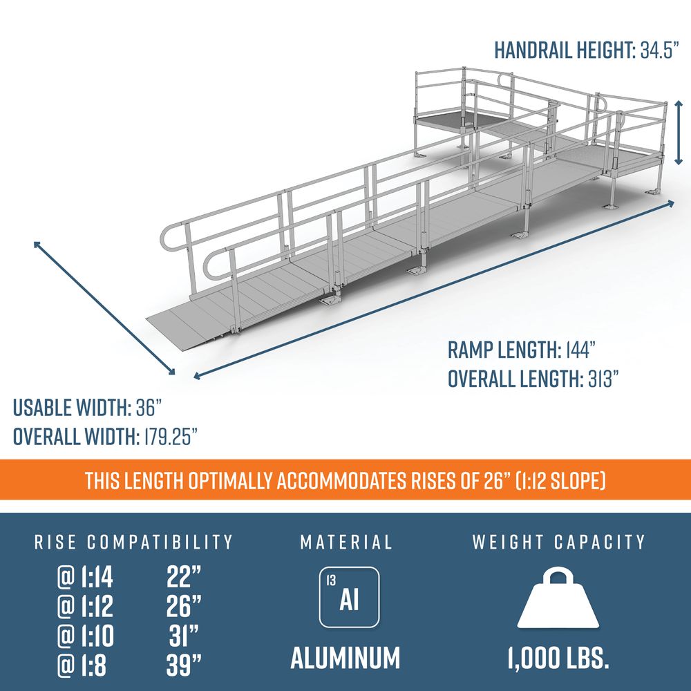 This 26' L L-Shaped Modular Ramp Kit w/4' Platforms Includes three 6' ramps, two 4’ ramps, one 4' x 4' top platform, one 4' x 4' turn platform, handrails, and all other necessary components. Depending on your rise and location, this ramp can be installed to accommodate slopes ranging from 1:8 to 1:14.