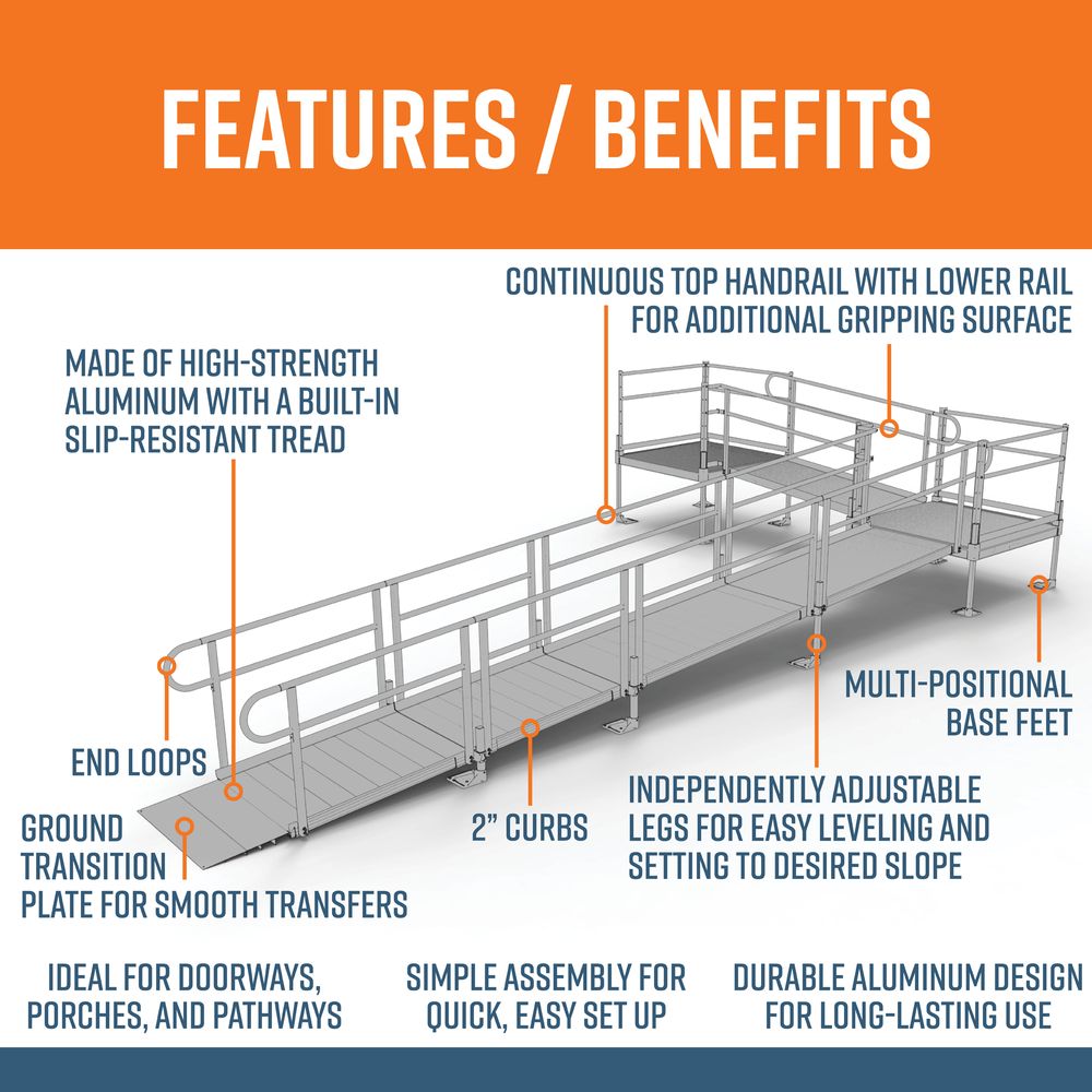 Constructed from high-strength aluminum with an extruded tread for all-weather traction, the ramp kit features multi-positional base feet with independently-adjustable legs so that setting the slope and leveling the ramp is as easy as possible. The lower plate ensure smooth ramp-to-ground transitions for mobility devices, and both the 2” curbs and two-tier handrails provide additional safety and security whether wheeling or walking. The flush finished sides have no protruding pieces in the ramp area to prevent catching.