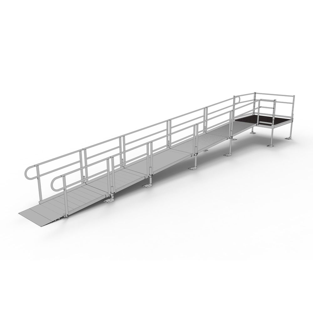 This 26' L Straight Modular Ramp Kit w/5' Top Platform Includes three 6' ramps, two 4’ ramps, one 5' x 5' top platform, handrails, and all other necessary components. Depending on your rise and location, this ramp can be installed to accommodate slopes ranging from 1:8 to 1:14.