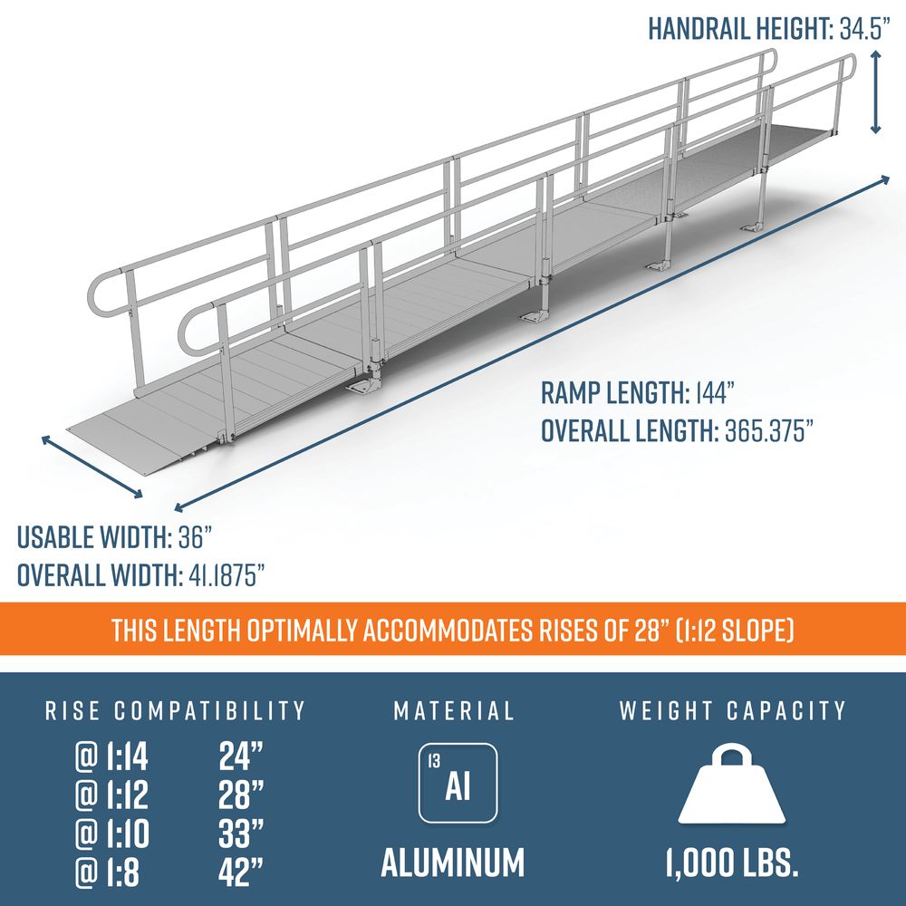 This 28' L Straight Modular Ramp Kit Includes four 6' ramps, one 4’ ramp, handrails, and all other necessary components. Depending on your rise and location, this ramp can be installed to accommodate slopes ranging from 1:8 to 1:14.