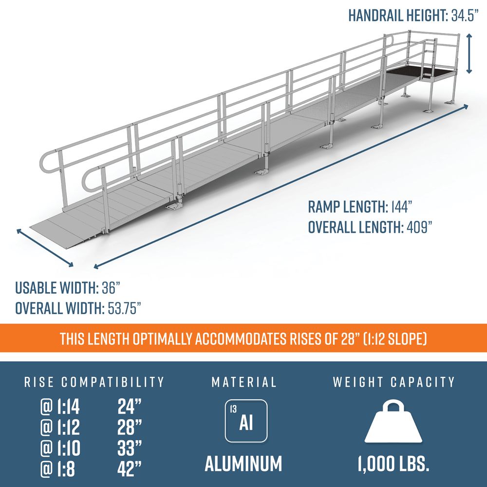 This 28' L Straight Modular Ramp Kit w/4' Top Platform Includes four 6' ramps, one 4’ ramp, one 4' x 4' top platform, handrails, and all other necessary components. Depending on your rise and location, this ramp can be installed to accommodate slopes ranging from 1:8 to 1:14.