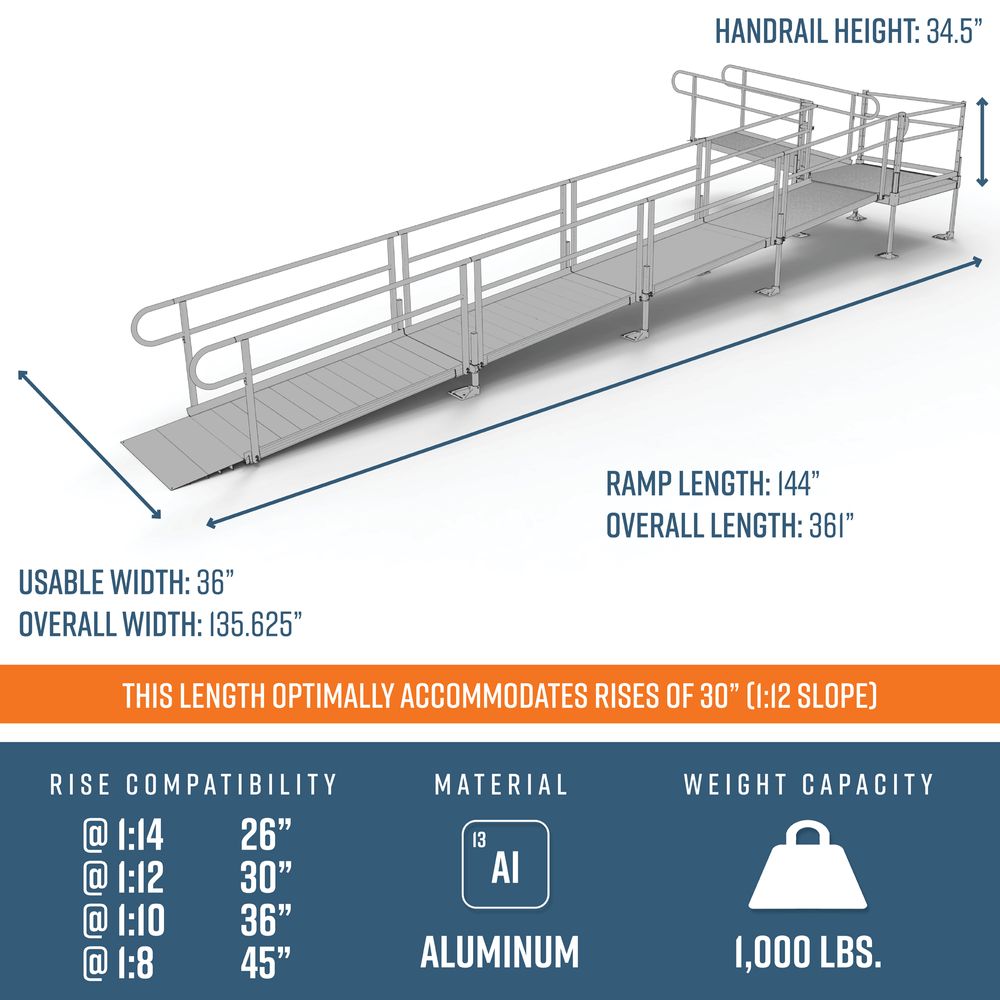 This 30' L L-Shaped Modular Ramp Kit w/4' Turn Platform Includes five 6' ramps, one 4' x 4' turn platform, handrails, and all other necessary components. Depending on your rise and location, this ramp can be installed to accommodate slopes ranging from 1:8 to 1:14.