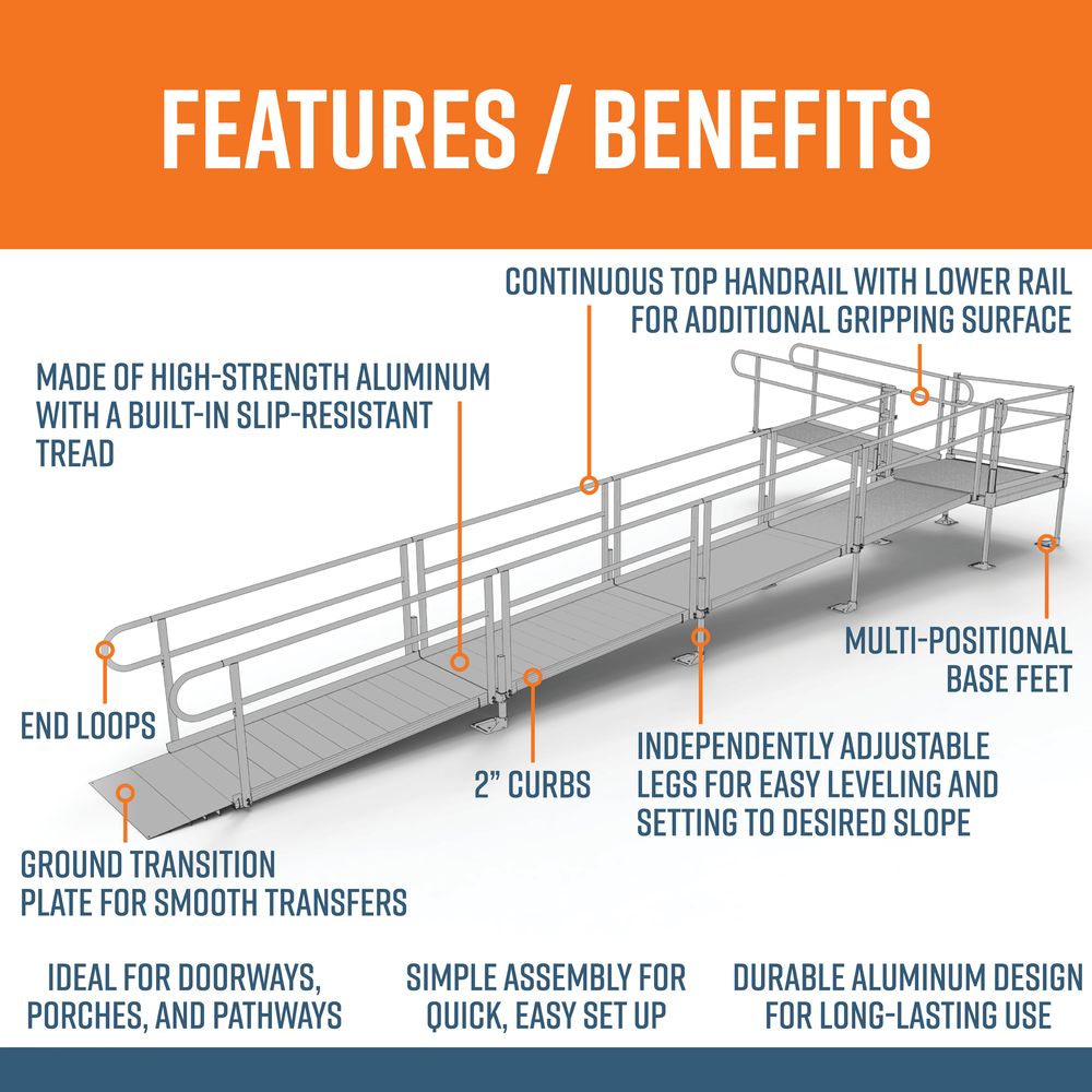 Constructed from high-strength aluminum with an extruded tread for all-weather traction, the ramp kit features multi-positional base feet with independently-adjustable legs so that setting the slope and leveling the ramp is as easy as possible. The lower plate ensure smooth ramp-to-ground transitions for mobility devices, and both the 2” curbs and two-tier handrails provide additional safety and security whether wheeling or walking. The flush finished sides have no protruding pieces in the ramp area to prevent catching.