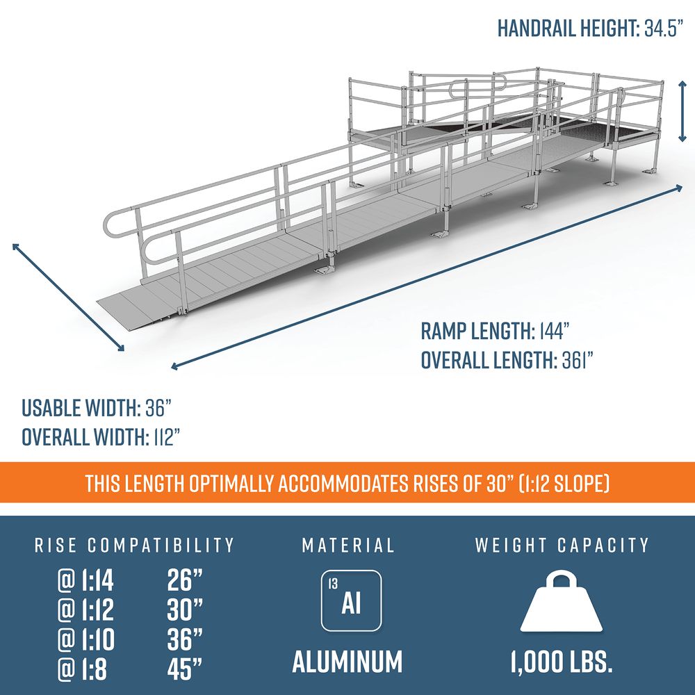 This 30' L U-Shaped Modular Ramp Kit w/4' Platforms Includes five 6' ramps, one 4' x 4' top platform, two 4' x 4' turn platforms, handrails, and all other necessary components. Depending on your rise and location, this ramp can be installed to accommodate slopes ranging from 1:8 to 1:14.