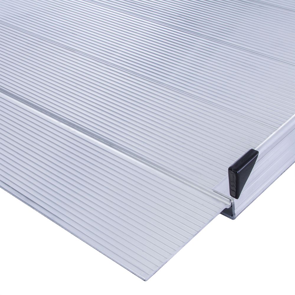 For increased safety and stability, our semi-permanent access ramp with hand rails is the perfect solution for your mobility needs. Manufactured from aluminum, this ramp is designed for scooters and wheelchairs in residential settings and features seamless construction, a slip-resistant surface, and a self-adjusting ground transition plate. The durable handrails provide additional stability for anyone using a walker, cane, or crutches. Weather-proof and durable, these maintenance-free ramps are an excellent alternative to wood. They will not rust or rot, guaranteeing years of use. Two pre-drilled mounting holes make it easy to permanently install the ramps if necessary.