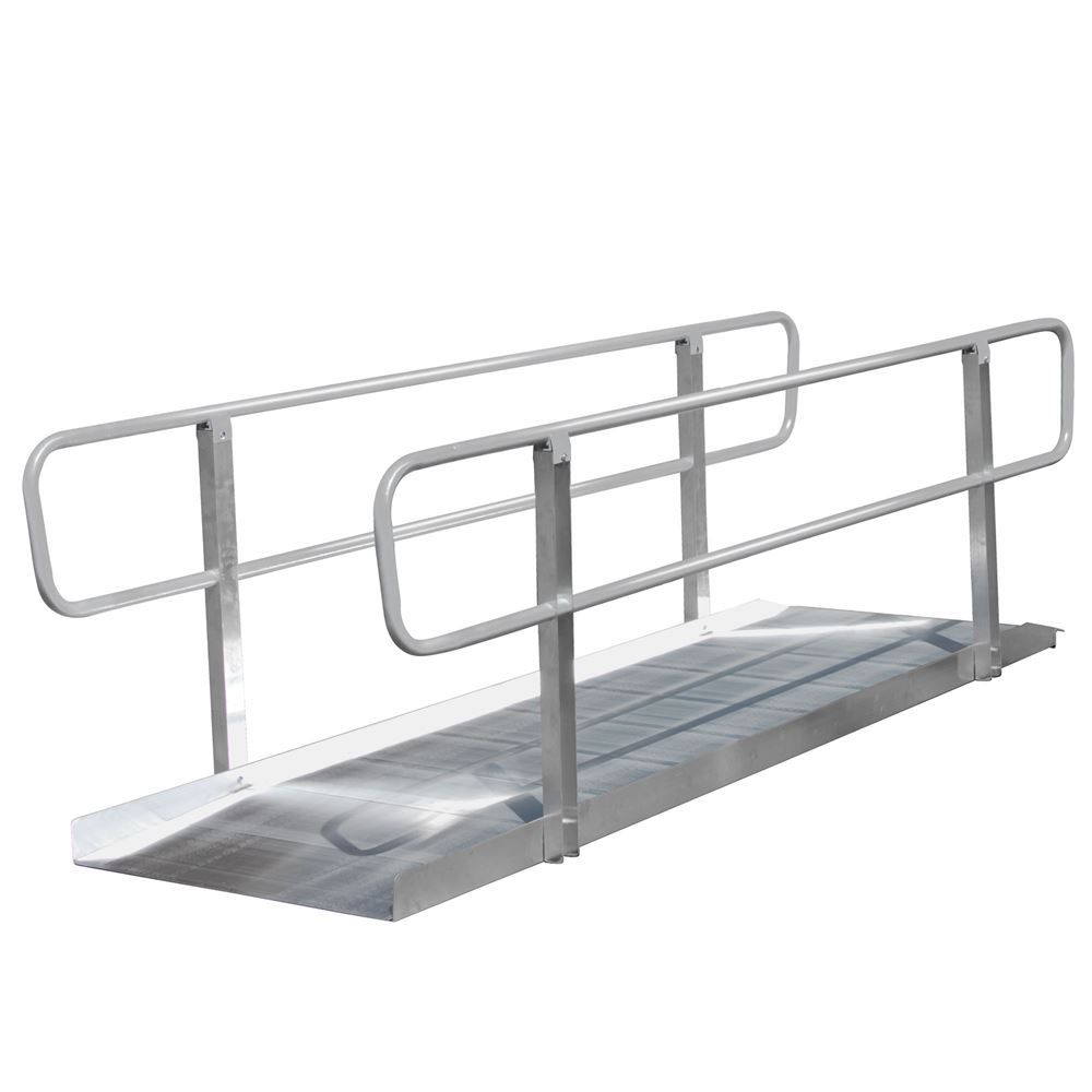 Each access ramp includes smooth handrails on each side for added safety and stability. The durable aluminum construction features a grooved surface on the walkway for maximum traction, a full-length step attachment lip, 2" raised side rails and a tapered entrance foot.