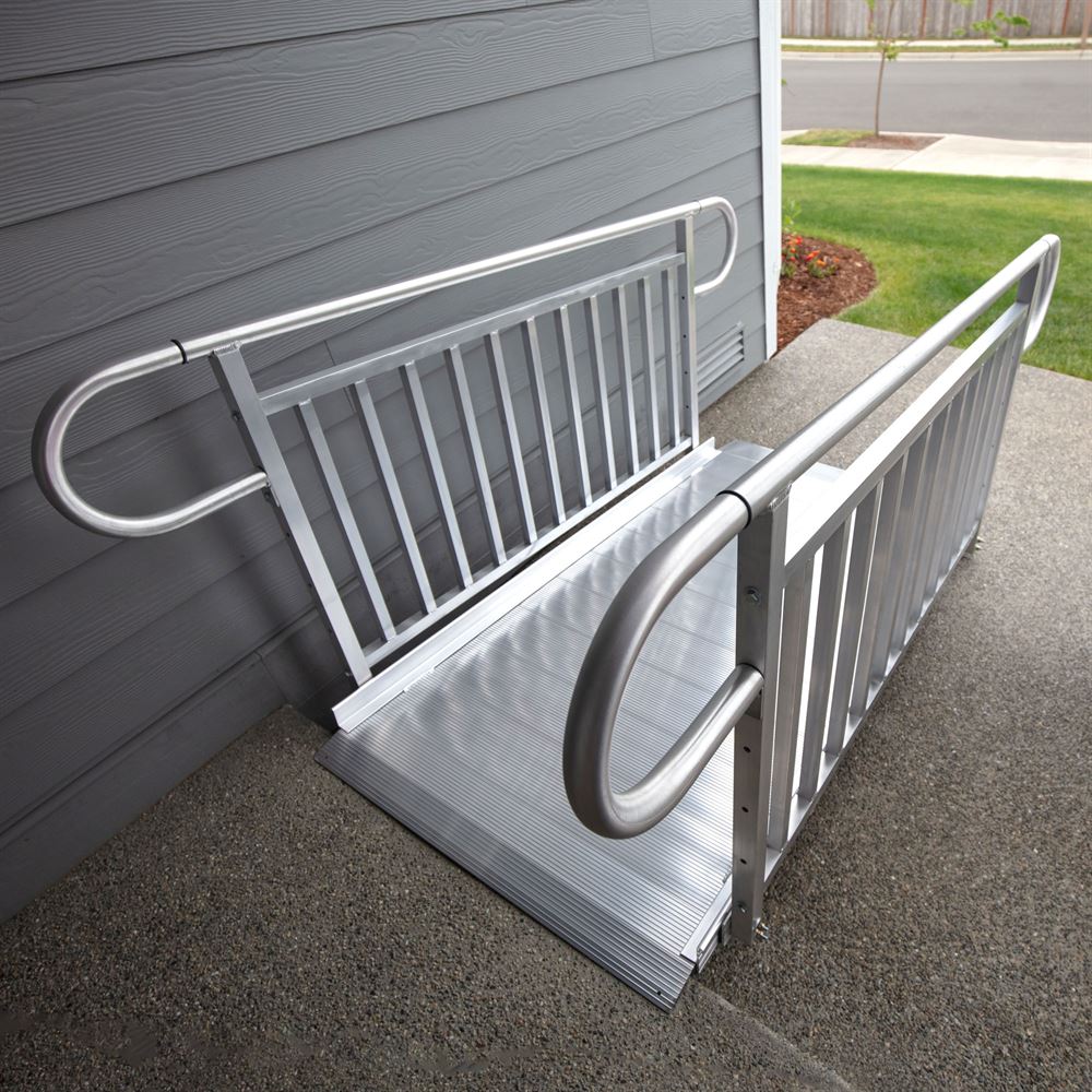 The 3' width provides ample room for most mobility devices, and anyone using a wheelchair, scooter, walker, cane, or crutches will appreciate the stability provides by the brushed aluminum two-line handrails. This ramp system can be used inside or outdoors, and it will never rust.