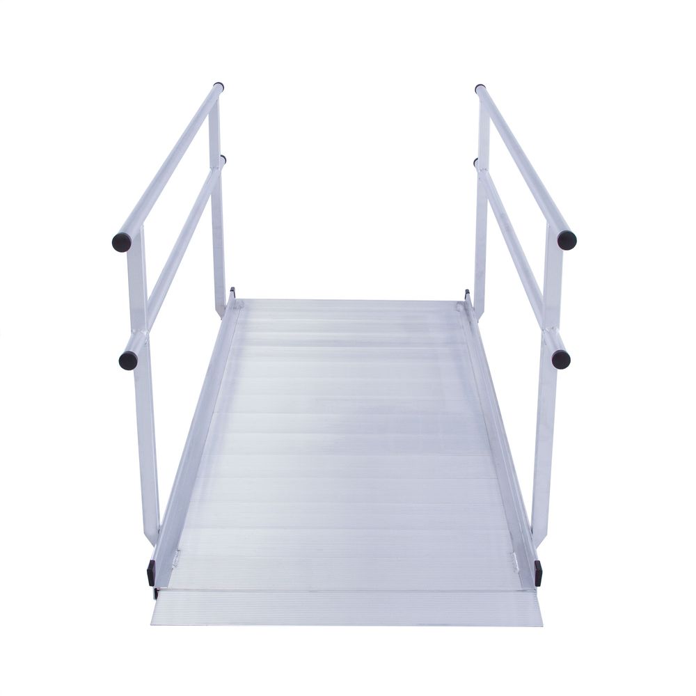 For increased safety and stability, our semi-permanent access ramp with hand rails is the perfect solution for your mobility needs. Manufactured from aluminum, this ramp is designed for scooters and wheelchairs in residential settings and features seamless construction, a slip-resistant surface, and a self-adjusting ground transition plate. The durable handrails provide additional stability for anyone using a walker, cane, or crutches. Weather-proof and durable, these maintenance-free ramps are an excellent alternative to wood. They will not rust or rot, guaranteeing years of use. Two pre-drilled mounting holes make it easy to permanently install the ramps if necessary.