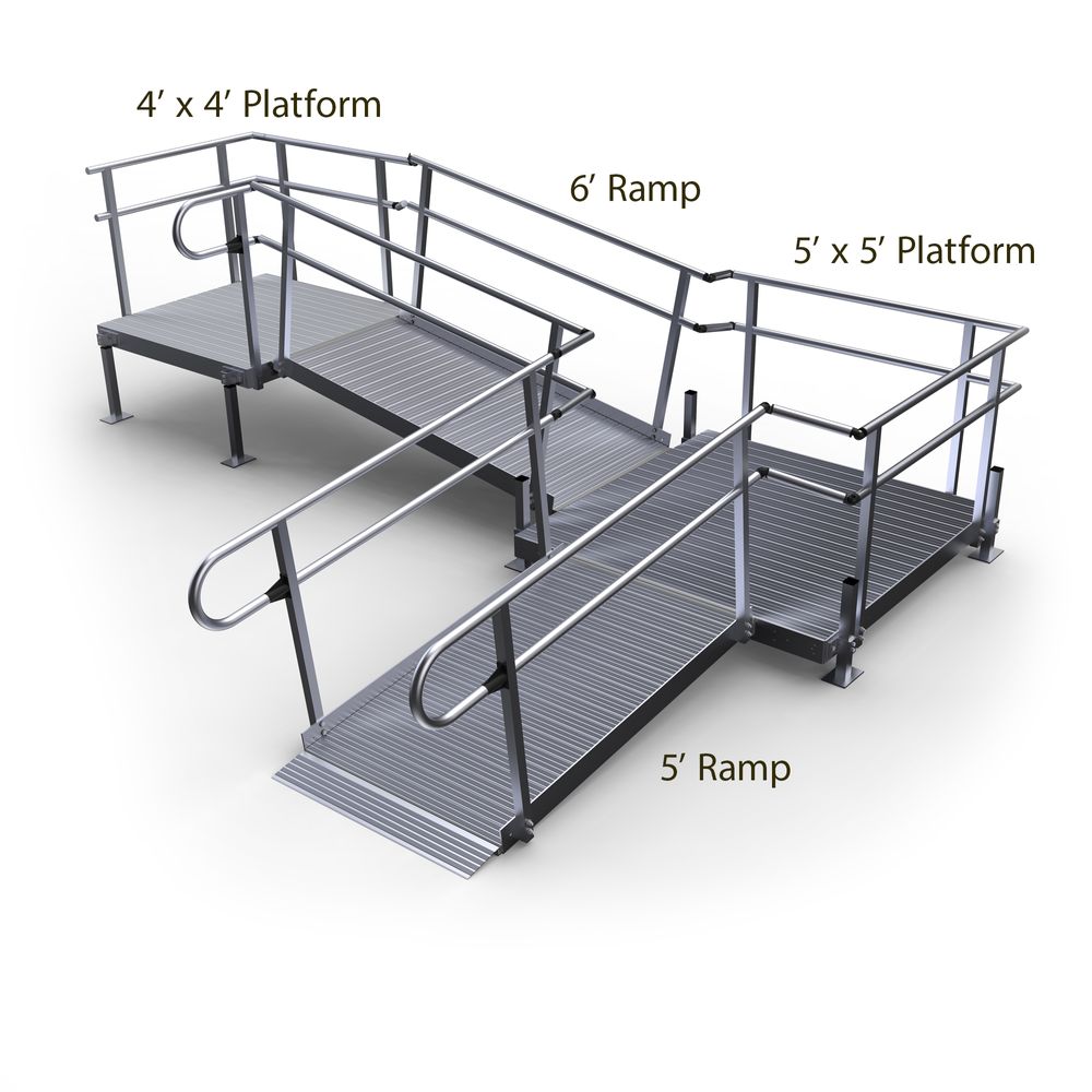 Featuring a 4' x 4' top platform, a 6' middle ramp, a 5' x 5' turning platform, and one 5' lower ramp sections with support stands. This all-in-one ramp kit can be installed on the left or right side of turning, depending on the configuration needs of your location. Smooth, looped double handrails and a low-gradient, non-slip ramp enables comfortable accessibility, whether you use a mobility device or simply have limited mobility.