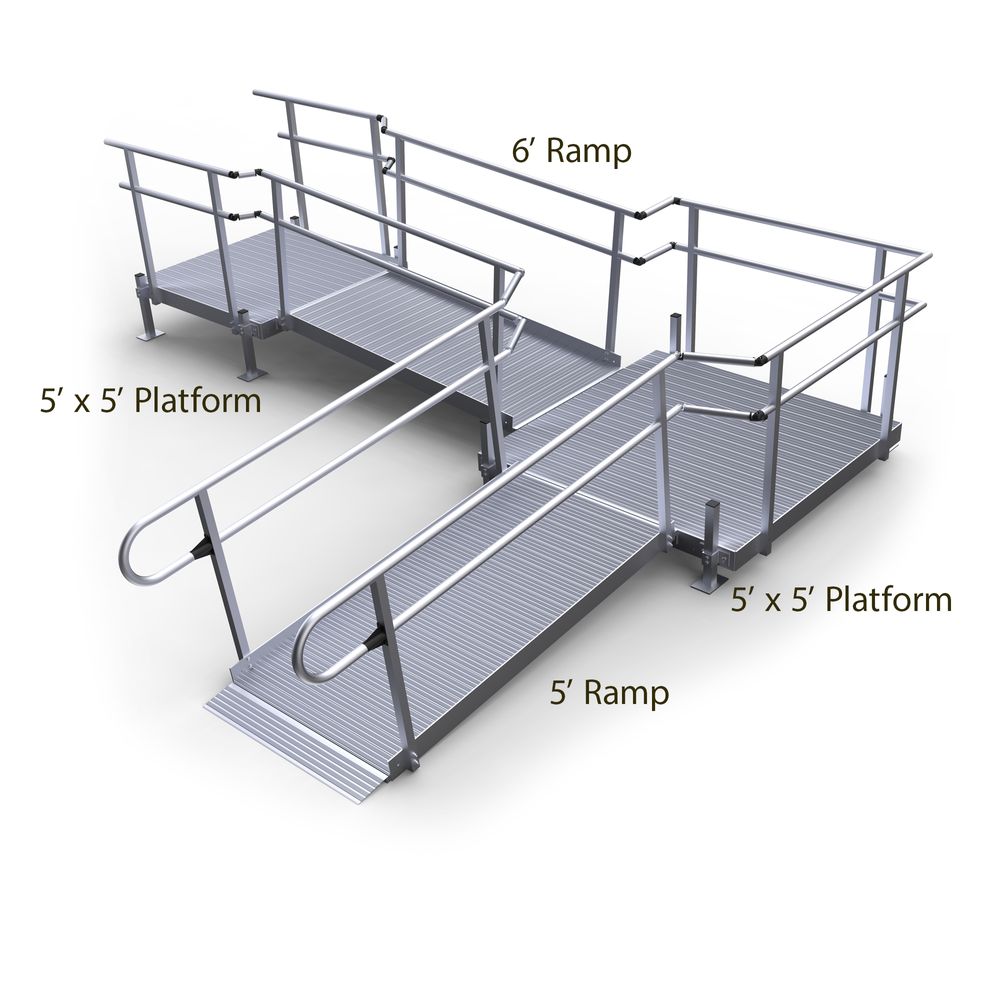 Featuring a 5' x 5' top platform, a 6' middle ramp, a 5' x 5' turning platform, and one 5' lower ramp section with support stands. This all-in-one ramp kit can be installed on the left or right side of turning, depending on the configuration needs of your location. Smooth, looped double handrails and a low-gradient, non-slip ramp enables comfortable accessibility, whether you use a mobility device or simply have limited mobility.