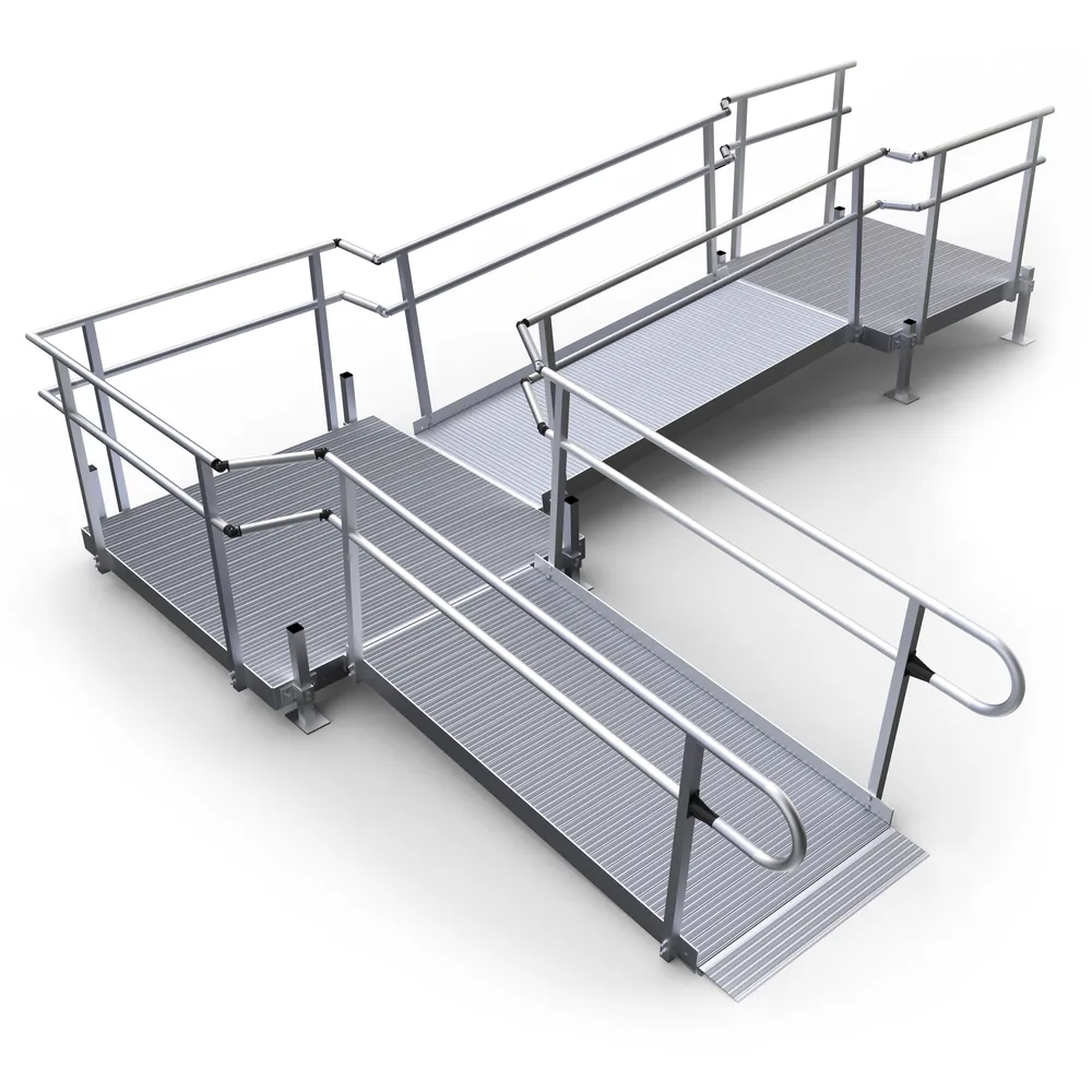 Featuring a 5' x 5' top platform, a 8' middle ramp, a 5' x 5' turning platform, and one 7' lower ramp section with support stands. This all-in-one ramp kit can be installed on the left or right side of turning, depending on the configuration needs of your location. Smooth, looped double handrails and a low-gradient, non-slip ramp enables comfortable accessibility, whether you use a mobility device or simply have limited mobility.