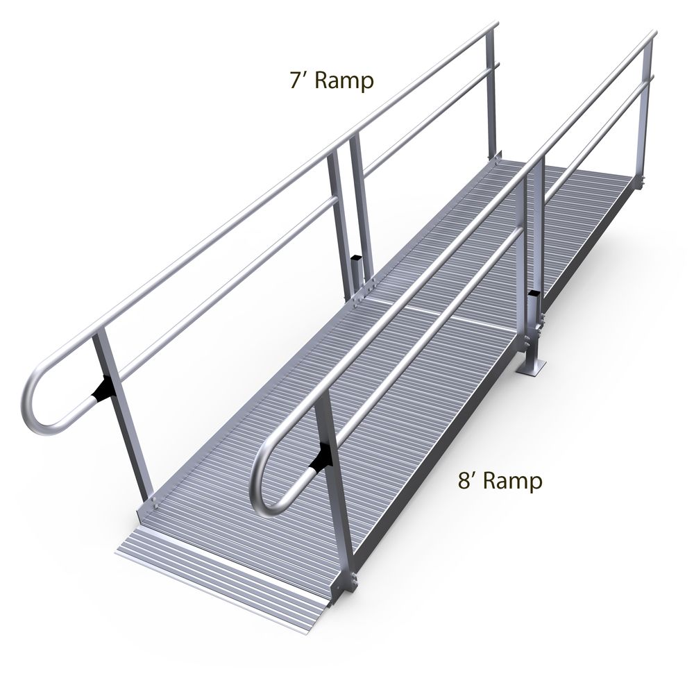 Featuring one 8' ramp and one 7' ramp with support stands, this Straight Ramp is designed with mobility in mind. It features a tapered, lower ramp plate for simple ground-to-ramp transition, a comfortable gradient and smooth, looped double handrails with an upper bar for those who are walking and a lower one for wheelchair users.