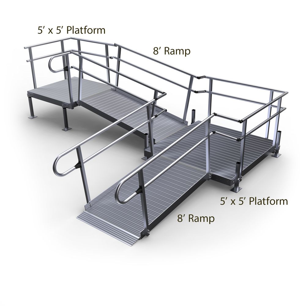 Featuring a 5' x 5' top platform, a 8' middle ramp, a 5' x 5' turning platform, and one 8' lower ramp sections with support stands. The lower ramp section installs on the turning platform on either the left or right side at 90-degrees from the lower ramp sections. Smooth, continuous handrails and a low gradient offer easy accessibility to your home, whether you're walking or using a wheelchair or other mobility device.