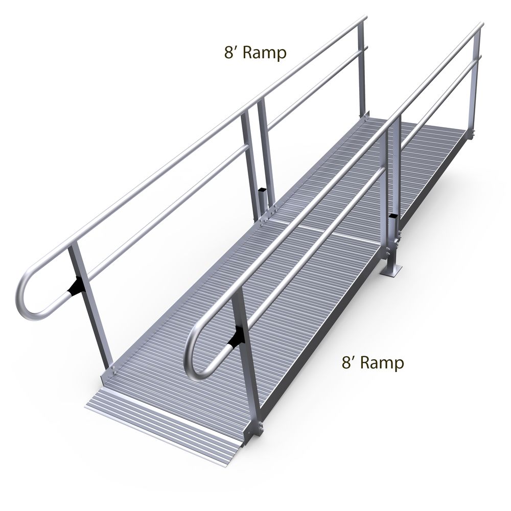 Featuring two 8' ramp sections with support stands, this Straight Ramp is designed with mobility in mind. It features a tapered, lower ramp plate for simple ground-to-ramp transition, a comfortable gradient and smooth, looped double handrails with an upper bar for those who are walking and a lower one for wheelchair users.