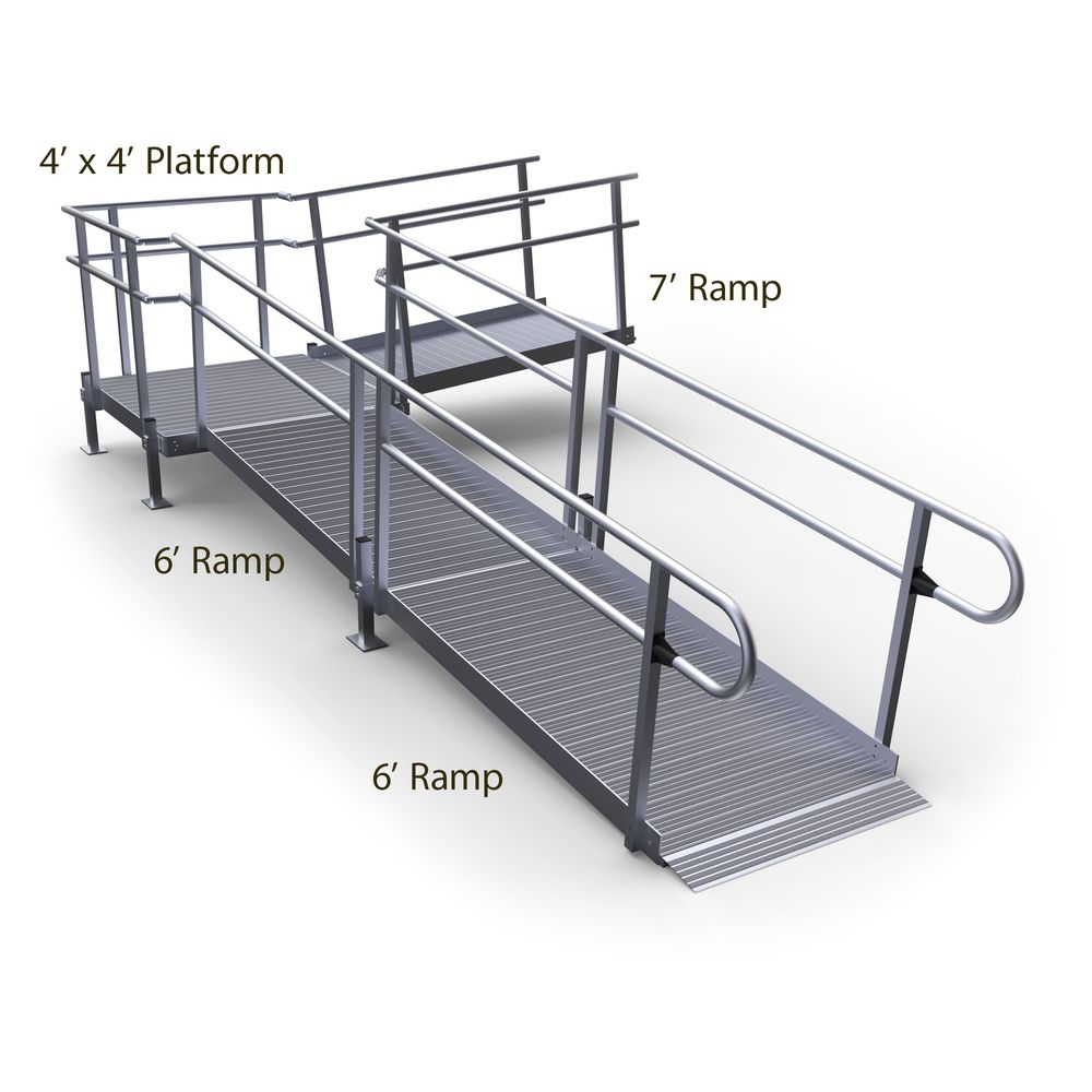 Featuring a 7' upper ramp, a 4' x 4' turning platform, and two 6' lower ramp sections with support stands. This all-in-one ramp kit can be installed on the left or right side of turning, depending on the configuration needs of your location. The turning platform serves as a landing or rest area. Smooth, looped double handrails and a low-gradient, non-slip ramp enables comfortable accessibility, whether you use a mobility device or simply have limited mobility.