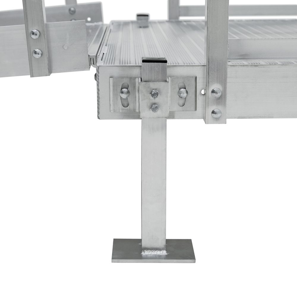 When a platform is incorporated into the modular ramp design, simple J-hook and tongue-and-groove attachments make the task of assembling them much easier than having to fuss with packages of bolts and nuts.