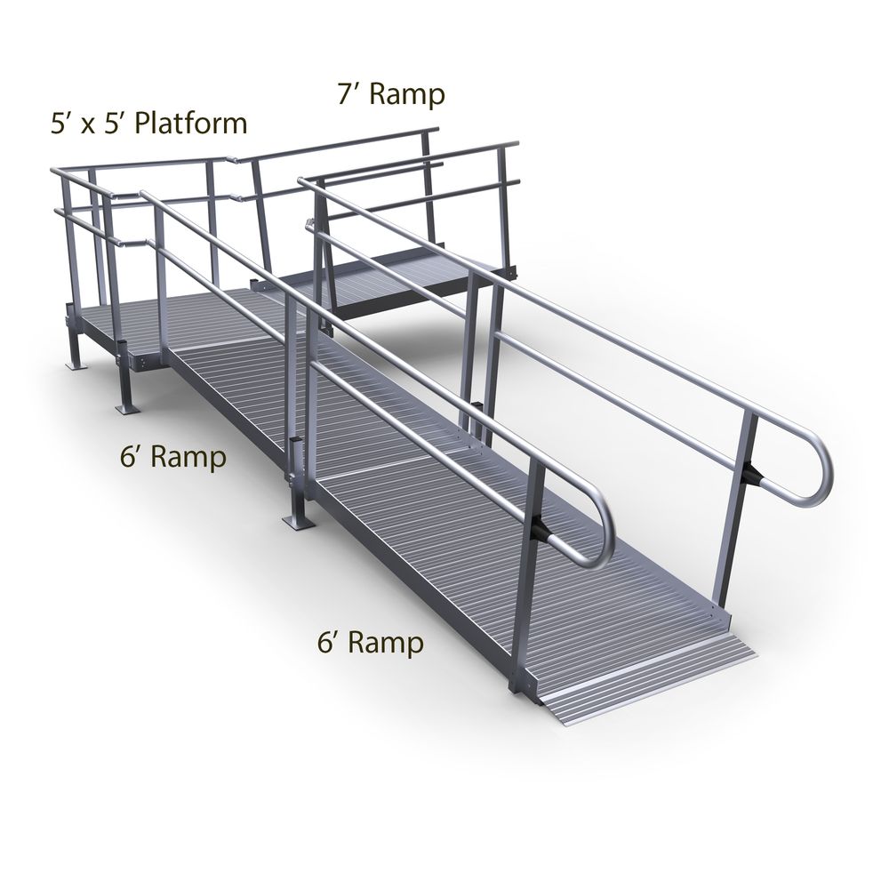 Featuring a 7' upper ramp, a 5' x 5' turning platform, and two 6' lower ramp sections with support stands. This all-in-one ramp kit can be installed on the left or right side of turning, depending on the configuration needs of your location. The turning platform serves as a landing or rest area. Smooth, looped double handrails and a low-gradient, non-slip ramp enables comfortable accessibility, whether you use a mobility device or simply have limited mobility.