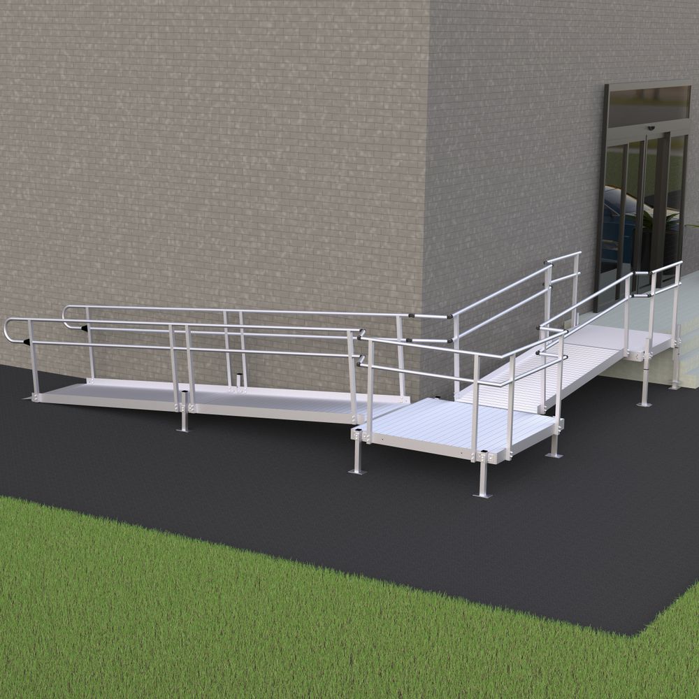 The modular 20' L-Shaped Ramp with 4' Top Platform comes with all components, and professional installation is included in the price. It's ADA-compliant design enables safe, comfortable accessibility regardless of your individual mobility needs. The lower ramps and platform assemble with either left- or right-side entry to accommodate your location needs and features a turning platform that serves as a landing or rest area.
