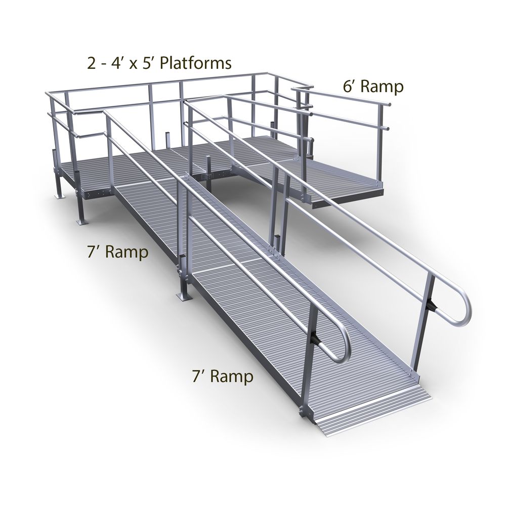 Features a 6' upper ramp, two 4' x 5' turning platforms, and two 7' lower ramp sections with support stands. The handrails on both sides of the full length of the ramp, as well as on the platforms, allow pedestrians to support and aid themselves as they walk up or down the ramp. A low gradient, non-slip surface enhances accessibility at your home for both pedestrians and those who use mobility aids.