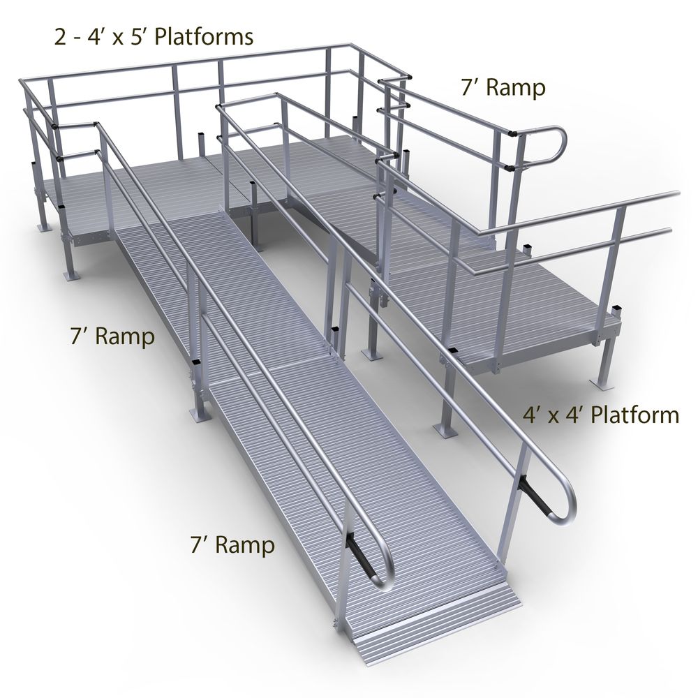 Features a 4' x 4' top platform, 7' upper ramp, two 4' x 5' turning platforms, and two 7' lower ramp sections with support stands. Install the handrails on the top platform for left- or right-side entry onto the ramp depending on your location needs. Smooth, continuous handrails and a low gradient offer easy accessibility to your home, whether you're walking or using a wheelchair or other mobility device.