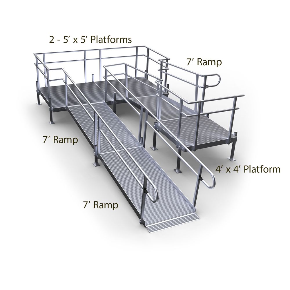 Features a 4' x 4' top platform, 7' upper ramp, two 5' x 5' turning platforms, and two 7' lower ramp sections with support stands. Install the handrails on the top platform for left- or right-side entry onto the ramp depending on your location needs. Smooth, continuous handrails and a low gradient offer easy accessibility to your home, whether you're walking or using a wheelchair or other mobility device.