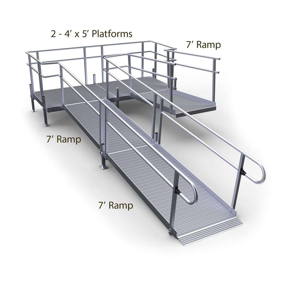 Features a 7' upper ramp, two 4' x 5' turning platforms, and two 7' lower ramp sections with support stands. The handrails on both sides of the full length of the ramp, as well as on the platforms, allow pedestrians to support and aid themselves as they walk up or down the ramp. A low gradient, non-slip surface enhances accessibility at your home for both pedestrians and those who use mobility aids.