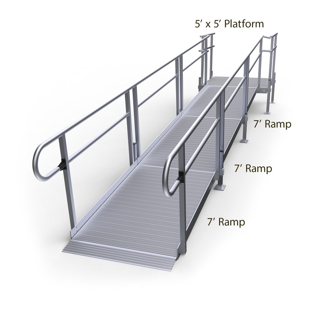 Featuring three 7' ramp sections and a 5' x 5' top platform designed for straight entry onto the ramp. Smooth, continuous handrails and a low gradient offer easy accessibility to your home, whether you're walking or using a wheelchair or other mobility device. A tapered bottom section smooths the transition for those in wheelchairs, powerchairs or on scooters.