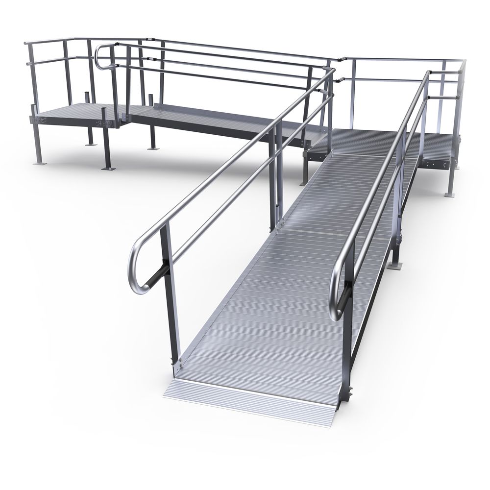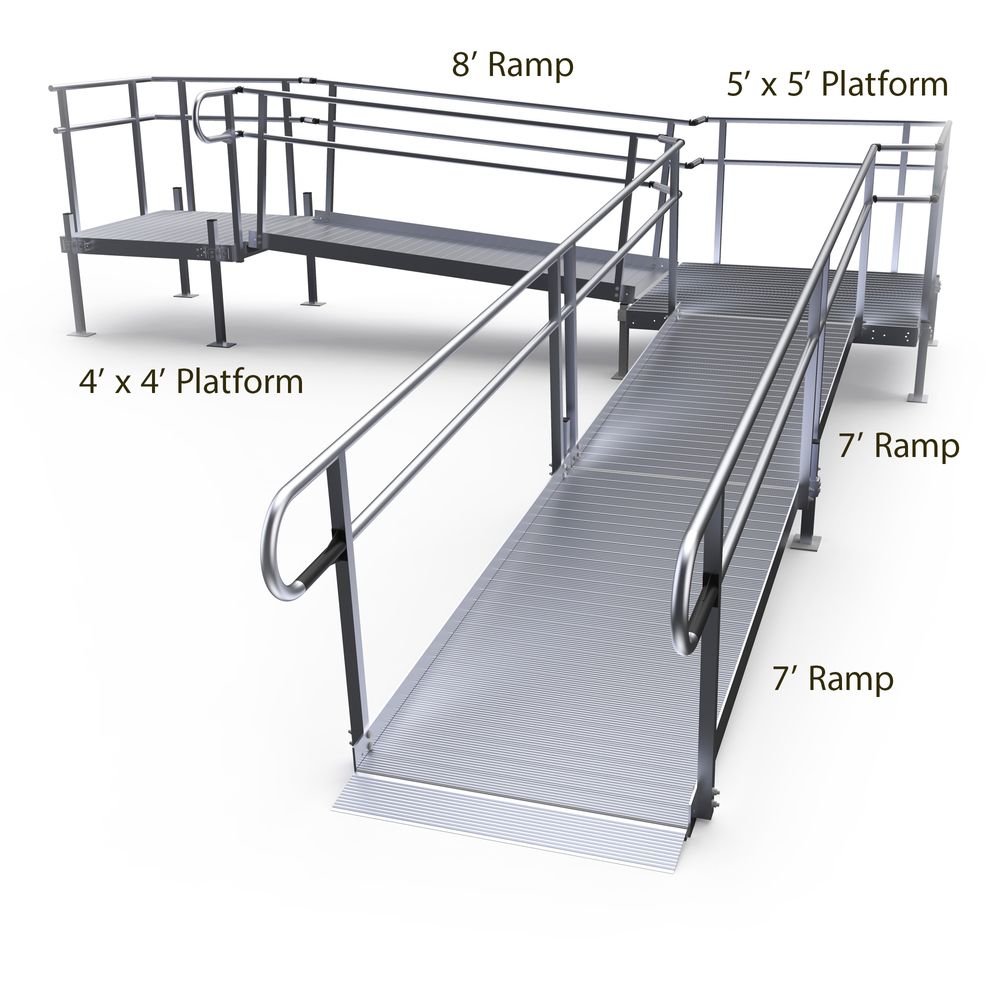 Featuring a 4' x 4' top platform, a 8' middle ramp, a 5' x 5' turning platform, and two 7' ramp sections with support stands. This all-in-one ramp kit can be installed on the left or right side of turning, depending on the configuration needs of your location. Smooth, looped double handrails and a low-gradient, non-slip ramp enables comfortable accessibility, whether you use a mobility device or simply have limited mobility.